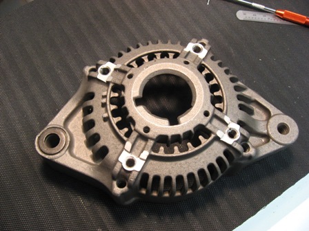Had to do some minor machining to the alternator casting to take the adapter plate. I used heli-coils in the aluminum for extra strength. I also had to turn down the rotor shaft to take the clutch drum. When I tried to thread the shaft, I got the die a little crooked and the drum wobbled like crazy. So I cut off the crooked part, bored the shaft and ran a tap into it using the lathe as a guide to keep it straight. I cut off the end of a 3/8" grade 8 bolt and locktited it into the bore. That worked much better.